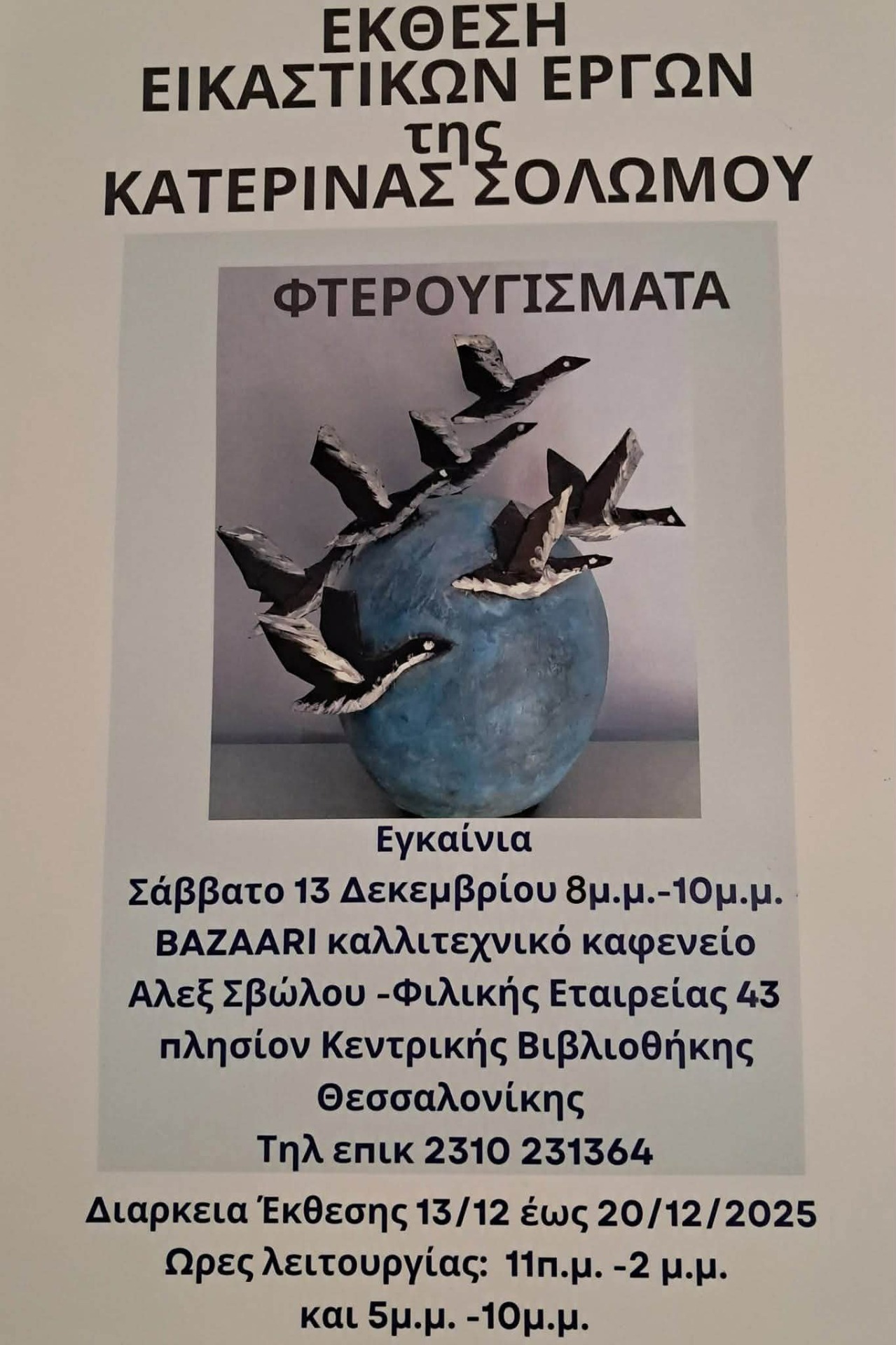 Η πρώτη ατομική έκθεση των έργων της εικαστικού Κατερίνας Σολωμού πραγματοποιείται από τις 13 έως 20 Δεκεμβρίου 2025 στο BAZAARI καλλιτεχνικό καφενείο (Φιλ.Εταιρείας 43). Ώρες λειτουργίας καθημερινά 11 π.μ.- 2 μ.μ. και 5 μ.μ.-9μ.μ. .