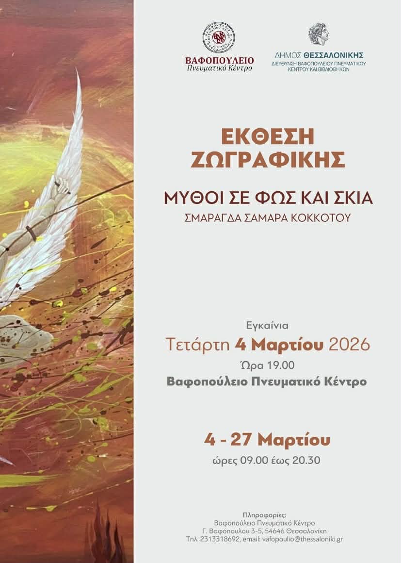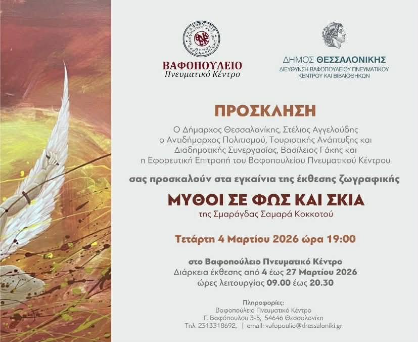 Εγκαίνια Τετάρτη 4 Μαρτίου στις 19:00 στο Βαφοπούλειο Πνευματικό Κέντρο (Γ. Βαφοπούλου 3-5, Θεσσαλονίκη).