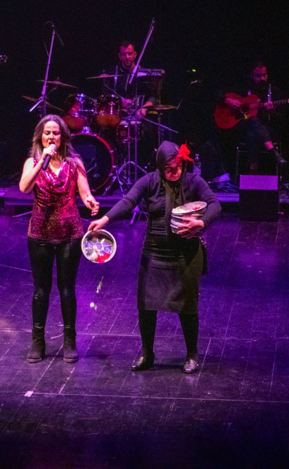 Επί σκηνής είμαι η Πέπη Κουρκούδιαλου. Να αναφέρω ότι ο ρόλος είχε φτιαχτεί για μια άλλη ηθοποιό. Σιγά σιγά όμως ο Γιώργος Οικονομίδης τον τροποποίησε και τον έφερε στα μέτρα μου. Τον εμπιστεύομαι πολύ, βλέπει πολλά χαρακτηριστικά και ιδιαιτερότητες στους γύρο του και μπορεί να τα προσθέτει σε ρόλους. Με την Πέπη έχω πολλά κοινά χαρακτηριστικά! Μπορεί να μην είμαι κουφή στην πραγματικότητα, αλλά πολλές φορές κάνω την κουφή. Μπορεί να βλέπω, αλλά πολλές φορές παριστάνω την τυφλή. Αυτό συμβαίνει είτε για να περάσω καλά, είτε για περάσει ο άλλο ανώδυνα μαζί μου. Είναι μια γυναίκα δεμένη με το παρελθόν της. Έχει ξεκινήσει εργαζόμενη στα μπουζούκια της παλιάς εποχής σαν λουλουδού και παρότι έγινε ότι έγινε μετά από χρόνια πήγε στο ίδιο μαγαζί να εργαστεί στην ίδια θέση. Αυτό δείχνει ένα άτομο δεμένο με τις ρίζες του. Είναι κοινό χαρακτηριστικό με εμένα, είμαι και εγώ δεμένη με τις ρίζες μου. Κάποιοι βλέποντας με μπορεί να με θεωρήσουν μοντέρνα, αλλά είμαι παλαιών αρχών μέσα μου. Επίσης, είναι μια γυναίκα που θέλει να κάνει τους γύρω της να γελάνε. Δεν διακρίνεται εύκολα αυτό το στοιχείο στην παράσταση. Είναι μια ηρωίδα-καρικατούρα. Είναι λοιπόν ένα στοιχείο που το έχω έντονα στην καθημερινότητά μου, μου αρέσει να κάνω τους γύρω μου να γελάνε! Μου αρέσει που έρχομαι σε επαφή με το κοινό. Από το μισό του έργο και μετά βρίσκομαι ανάμεσα στους θεατές και διασκεδάζω μαζί τους, μοιράζω τα λουλούδια μου, λέω τις ατάκες μου.
